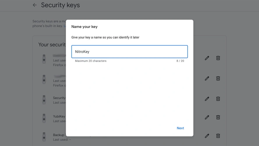 在下一个屏幕上,您将被要求为您的密钥命名。在这里使用一些描述性的东西。也许是Key的型号(Nitrokey),一些物理特征(Blue Key),或者它的位置(绑在我的腿上)。任何能帮你记住该用哪把钥匙的东西!