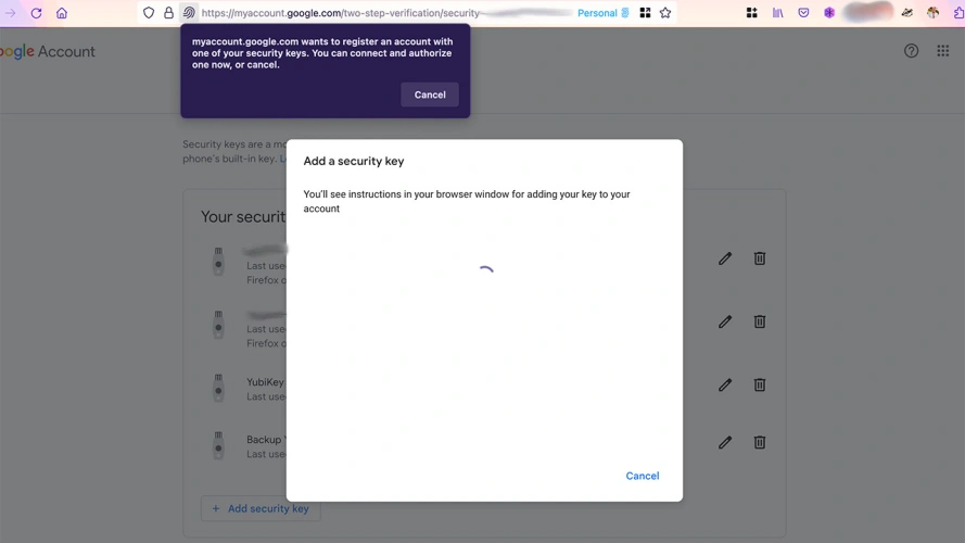 在下一个屏幕上,将提示您按照浏览器中的说明进行操作。根据您喜欢的浏览器的不同,它们的外观也会有所不同。然后你将被告知插入你的安全钥匙。如果你已经插上电源了,只要等一两下就行了。在某个时刻,系统可能会提示您轻触按键,因此请务必仔细阅读说明。