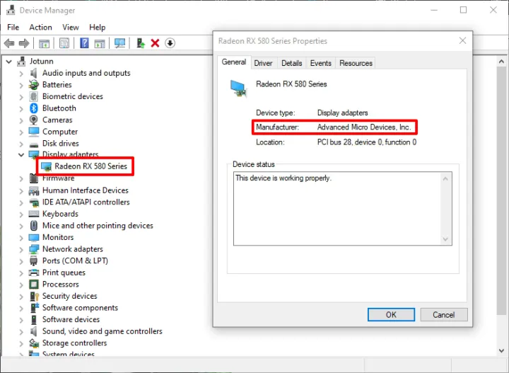 如果你不确定是哪家公司设计了这个芯片,你可以右击它,然后选择属性来查看制造商–在我的例子中是Advanced Micro Devices,或AMD。(请注意,Device Manager使用您的显卡和驱动程序来确定您使用的是什么GPU,因此如果您怀疑可能安装了错误的驱动程序,您应该跳到下一节。)