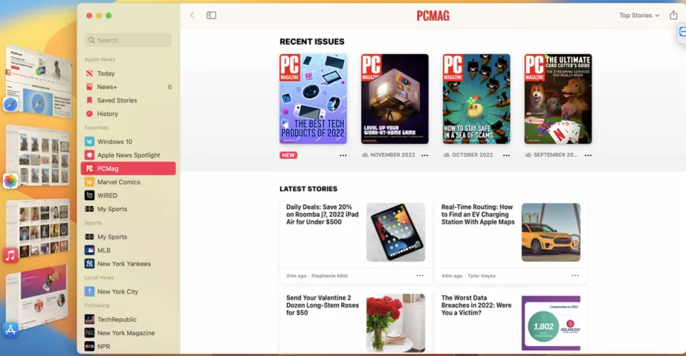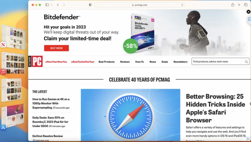 点击左侧的任何缩略图,即可将该应用程序移至中心。根据Mac的屏幕大小和分辨率,Stage Manager最多可以显示六个不同的应用程序,一个在中间,五个在旁边。如果你打开第七个应用程序,左边的一个应用程序会从屏幕上消失,但你仍然可以从Dock打开它。