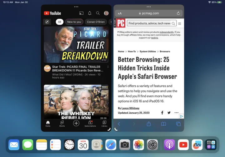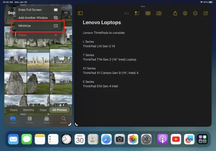 然后,您可以从主屏幕或Dock打开第二个窗口。然后,两个打开的窗口并排出现。然后,可以使用打开的窗口中的曲线根据需要调整每个窗口的大小。通过将图标从Dock拖到屏幕上来打开更多应用程序。