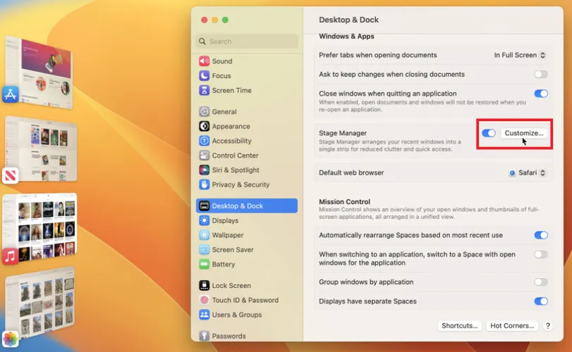 要在Mac上自定义Stage Manager的某些设置,请打开系统设置>桌面和Dock,然后向下滚动到Stage Manager部分并单击自定义。您可以关闭最近的应用程序以隐藏左侧的缩略图。