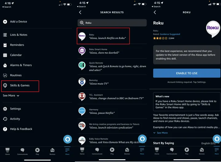 如果你有一个亚马逊Echo和一个Roku,让Alexa来控制你的Roku。首先,你必须打开Alexa移动应用程序,选择Skills&Games,然后搜索Roku,从而将这两个账户联系起来。找到Roku设备后,点击Enable to Use,登录到您的Roku帐户,然后选择要链接的Roku设备(如果您有多个设备,则选择全部)。