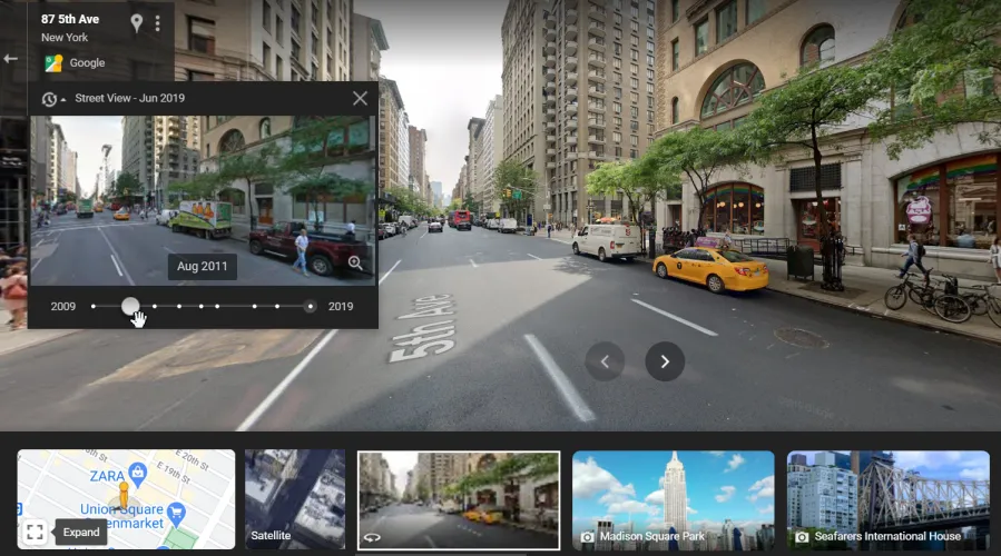 多年来,街景收集了大量的街道图像。2014年,谷歌推出了时间旅行,让用户可以看到街景随着时间的推移发生了怎样的变化。点击桌面上地图左上角的小秒表图标(如果可用),就可以在街景中访问这种四维制图体验,它会提示一个滑动比例尺,允许您随着时间的推移在街景中跳跃。(要更深入地了解1994至2018年间地球表面的变化,请查看谷歌地球引擎。)