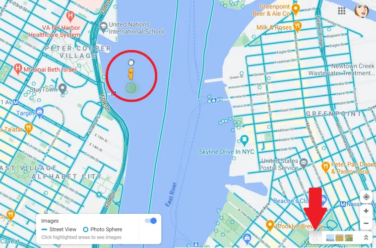 看到桌面上谷歌地图右下角的那个黄色小人了吗?这就是《佩格曼》(或者,《佩格曼》)。你可以拿起Peg Man,把它放在地图上的任何地方,进入那个位置的街景。Peg Man将在左下角的嵌入式地图窗口中定位为当前视图。
