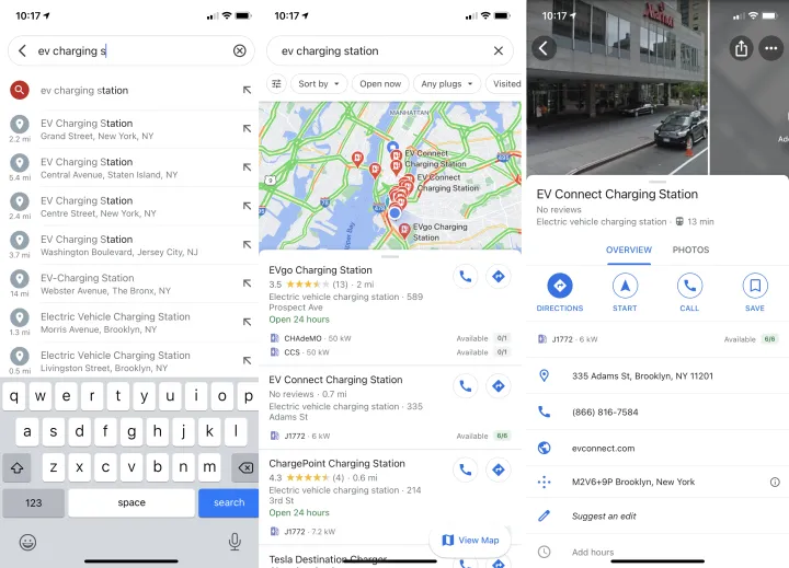 越来越多的电动汽车(EV)上路,谷歌地图也在适应。你可以在谷歌地图上搜索“电动汽车充电”或“电动汽车充电站”,它会根据交通状况、你的充电水平和预期的能源消耗为你推荐最适合你的充电站。你可以根据插头的类型进行过滤,如果你很匆忙,你可以选择快速充电来找到电压最高的充电站。