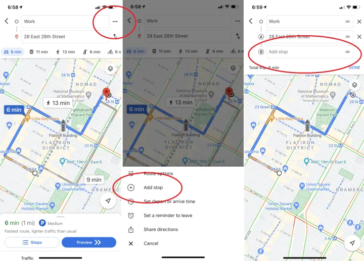 汽车旅行很少包括从A点到B点;更常见的情况是,它们是从A到咖啡馆到图书馆到乔家到B。谢天谢地,谷歌使预测真正的旅行成为可能。要在谷歌地图移动应用程序中添加多个目的地,请输入您的起点和最终目的地,然后单击右上角的三点菜单。这会出现一个弹出菜单,其中包含“Add Stop”选项。点击它,你就可以创建一条有多个停靠点的路线。你甚至可以在你的行程中拖放站点。(请注意,当您使用公共交通选项时,这不起作用。)