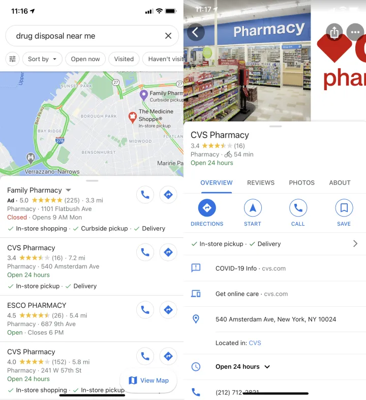 搜索工具帮助用户找到安全的药品处置地点。在搜索栏中输入“药品处置”,即可调出药房、医疗中心和地方当局的位置,在这些地方你可以安全地处置多余的药物。