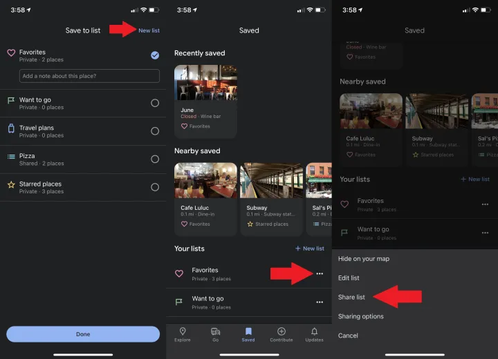 如果你想分享多个最喜欢的地点,你可以在谷歌地图中创建一个类似Pinterest的列表。保存最喜欢的地方时,点击新建列表以创建集合(如“布鲁克林的泰国餐馆”)或将其添加到现有集合中。你可以在列表下的已保存选项卡中找到它们;点击三点菜单,然后点击共享列表,向朋友发送一个链接。