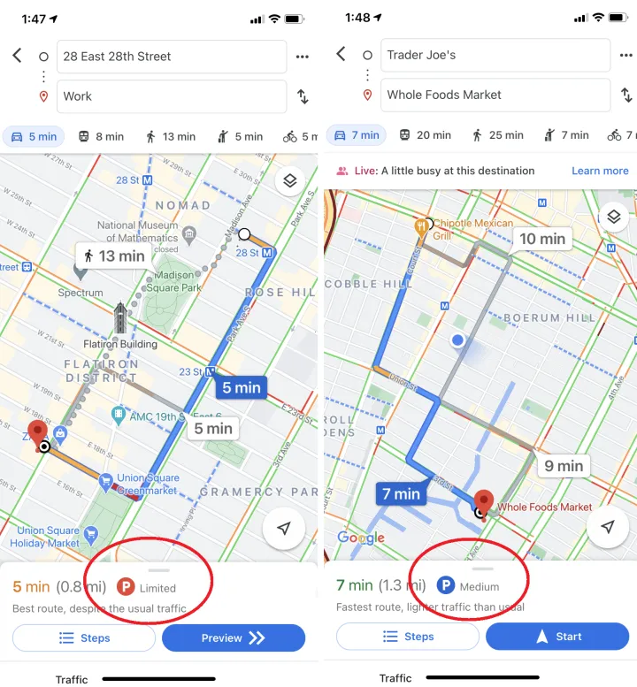 谷歌地图可以提供基于实时交通数据的逐个转弯方向,但它也可以让你一瞥停车情况。当你在iOS或Android上搜索某个地点的驾驶路线时,你可能会在屏幕底部看到一个P标志,以及三个标志之一:有限、中等和容易(对于拥有大型停车场的零售商来说,还有现场标志)。这可以帮助你决定你需要分配多少时间来停车,或者甚至是其他交通方式是否会是更好的选择。