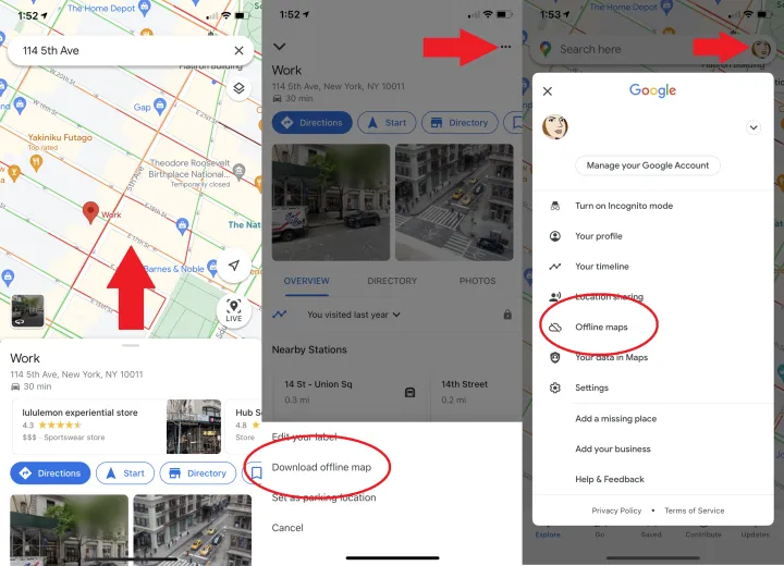 今天,地图在移动设备上是最有用的,这带来了一个问题:当你需要地图时,你可能会发现自己的覆盖范围有限(或根本不存在)。为了提供帮助,谷歌地图支持离线访问。输入地址或区域,向上滑动屏幕底部的菜单,点击省略号图标,然后选择下载脱机地图。如果您的设备上有足够的存储空间,则会保存有问题的地图。要稍后访问它,请点击你的头像>离线地图,然后你就可以在下载的部分中获得该地区的企业信息和逐个转弯的方向。
