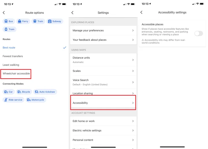 那些有行动不便问题的人可以通过在寻找火车或公共汽车方向时点击选项>轮椅可到达的方式来搜索轮椅可到达的交通路线。与此同时,当你到达目的地时,无障碍地点设置会提供有关该地点的轮椅无障碍信息。