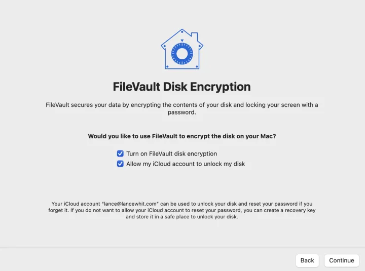 接下来,系统会询问您是否要使用FileVault对Mac上的磁盘进行加密。要保护磁盘和数据的安全,请选中打开文件存储库磁盘加密选项。此外,选中允许我的iCloud帐户解锁我的磁盘,以防你忘记你的Mac密码。
