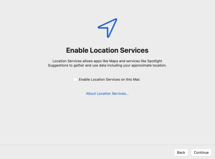对于定位服务,你可以启用或禁用苹果地图和天气等基于位置的应用程序。然后,您可以通过从下拉菜单中选择最近的城市或单击地图上的某个位置来设置时区。