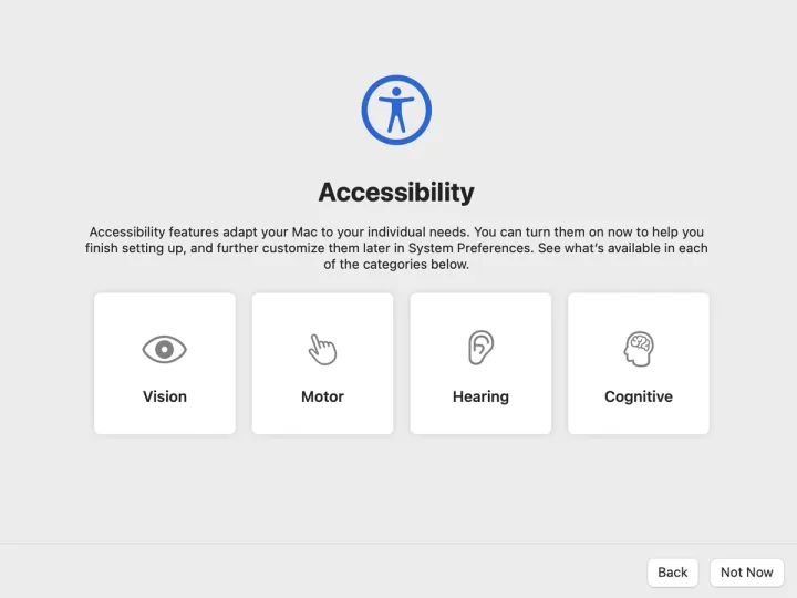 一旦电脑通电,第一步就是选择您所在的国家或地区。系统将询问您是否要设置某些辅助功能来帮助视觉、听觉和其他方面。选择一个,如果是这样的话。否则,请单击现在不执行此操作或稍后进行设置。