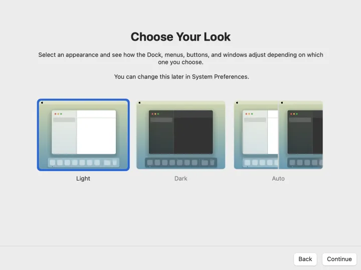 然后,您可以通过在亮模式、暗模式或自动模式之间进行选择来选择桌面的主题,这将根据一天中的时间更改主题。即使在初始设置之后,也可以随时在显示设置中更改此选项。