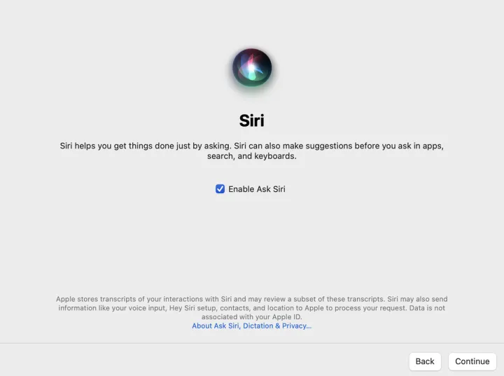 如果你想在Mac上使用苹果的语音助手,请勾选Enable Siri旁边的框。如果你启用了Siri,你会经过一系列的屏幕,在这些屏幕上你会说出某些短语,这样Siri就可以识别你的声音。