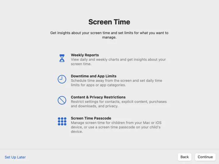 接下来,决定是否要与苹果分享分析数据。单击关于分析和隐私链接,了解如何收集和使用此数据。若要限制在此Mac上访问某些应用程序和网站的时间,请考虑打开屏幕时间。否则,请单击“稍后设置”。