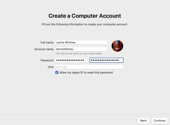 在Computer Account屏幕上,确认您的全名并创建一个帐户名,以便在登录Mac时使用。如果愿意,可以输入密码并添加提示。选中Allow My Apple ID to Reset This Password旁边的框,这样如果您忘记了密码,就可以恢复您的帐户。如果您想要将其更改为备忘录、表情符号、字母或照片,请单击您的帐号名称旁边的图像。单击继续以完成您的帐户设置。