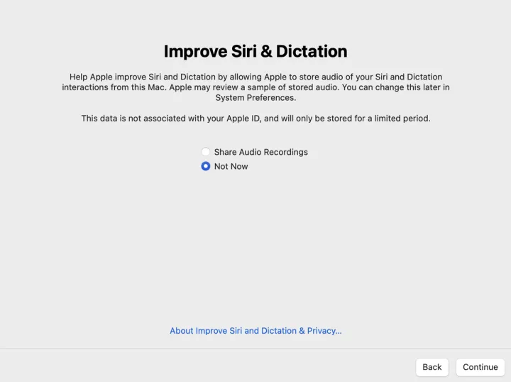 如果您同意Apple访问您的录音以帮助改进Siri,请选中共享录音。你可以通过点击关于改进Siri和听写与隐私链接来了解更多信息。如果您不想共享此数据,请勾选Not Now。