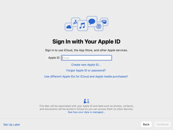 然后,您可以选择使用迁移助手,它允许您从另一台Mac、Time Machine Backup或Windows PC传输数据。如果您有要迁移的内容,请选择相应的选项并完成该过程。如果选择现在不传输数据,则可以在以后通过Migration Assistant传输数据,即使在设置了计算机之后也是如此。