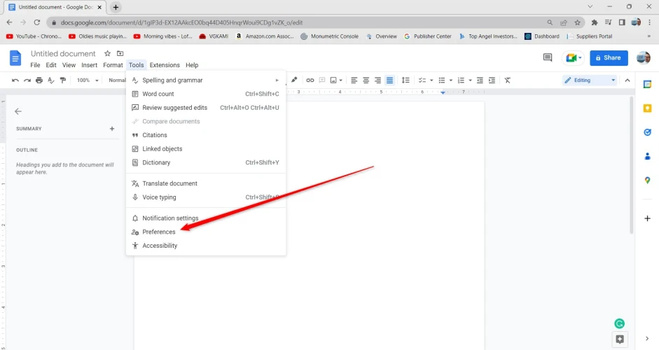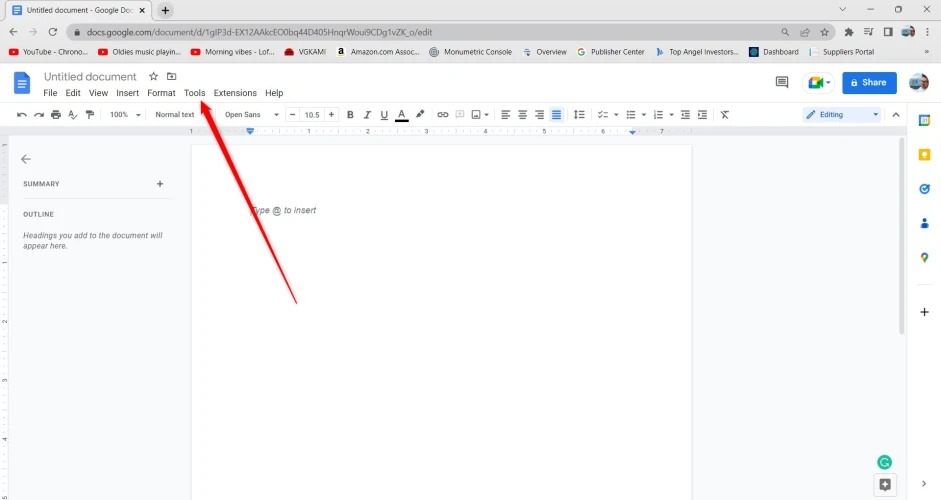 在您的台式PC上,启动您选择的浏览器并打开Google Docs。接下来,打开一个文档,然后单击工具在屏幕顶部的工具栏中。