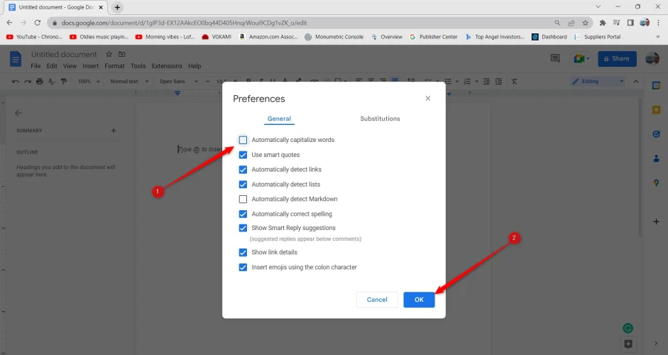 谷歌文档将不再在你打字时自动将文本大写。如果您想再次启用该功能,请返回首选项菜单,选中自动将单词大写旁边的框,然后单击确定。