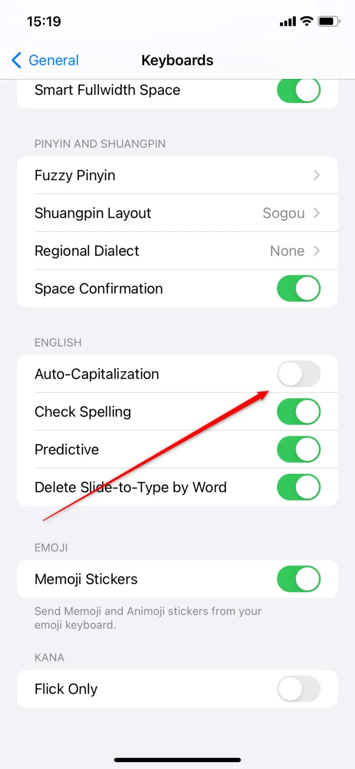 在iPhone上,请转到设置>一般信息>键盘。在此屏幕上,切换旁边的滑块自动大写转到关的位置。