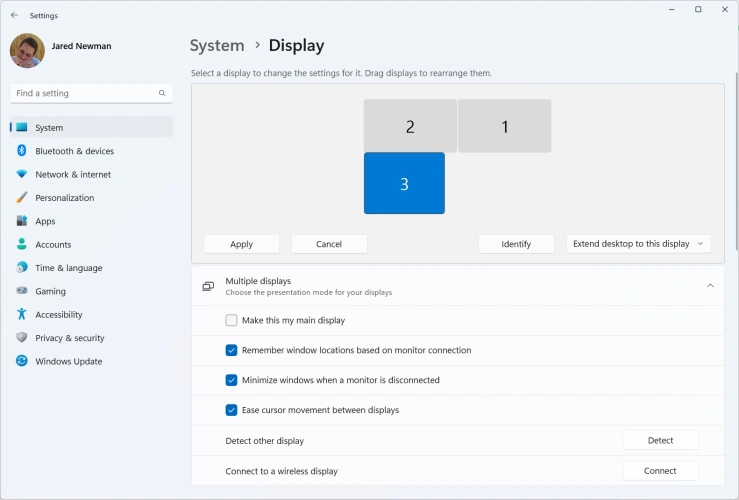 确保也在Windows中配置您的监视器。进入设置>系统>显示,你会看到所有屏幕的布局,你可以拖放它们来反映它们在你办公桌上的实际位置。现在,您可以向其他屏幕的方向移动鼠标,它们将位于您预期的位置。