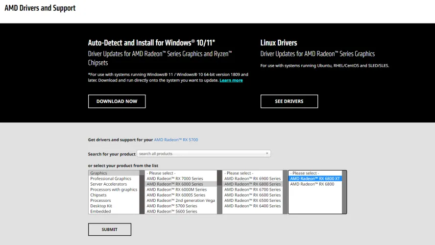 如果您正在寻找AMD处理器的驱动程序,您可以在相同的驱动程序和支持页面上找到它们。只需点击选择菜单中的处理器,然后从右边的框中选择您的CPU。