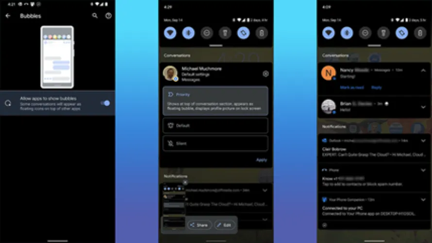 Android 13可以让你选择消息通知,这样一些联系人就会更突出,对话就会保持在一起。你现在可以将消息设置为以气泡形式显示在任何其他正在运行的应用程序的顶部。你只需在设置中打开它们,并将联系人设置为优先级。在通知中还有另一个气泡设置,这使得查找和回复对话变得更容易。您还可以自定义这些应用程序的优先级。将其设置为使您的设备始终通知您特定的气泡对话,即使启用了免打扰,将其设置为正常通知您,或将您气泡的对话完全静音。