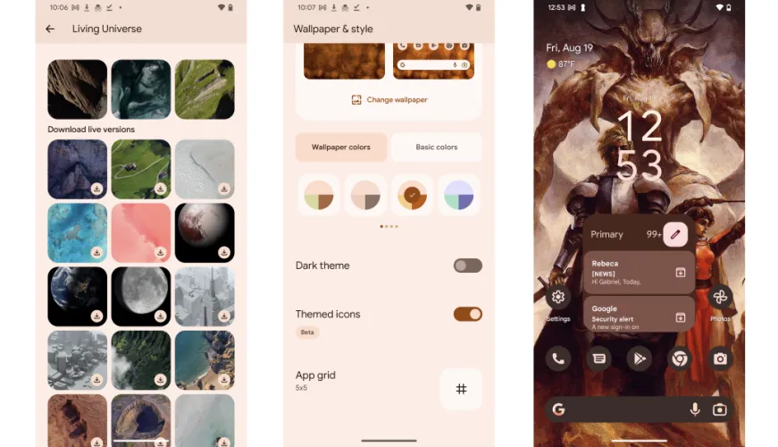 Android 12中引入了Android材料,并在Android 13中进行了进一步改进。这是一种定制设备用户界面(UI)的颜色和样式的时尚方式。Android操作系统自动采用配色方案来匹配您的背景墙纸,然后您可以通过调整每个UI元素的颜色进行微调。您还可以修改主屏幕小部件及其位置,或调整应用程序图标的颜色。