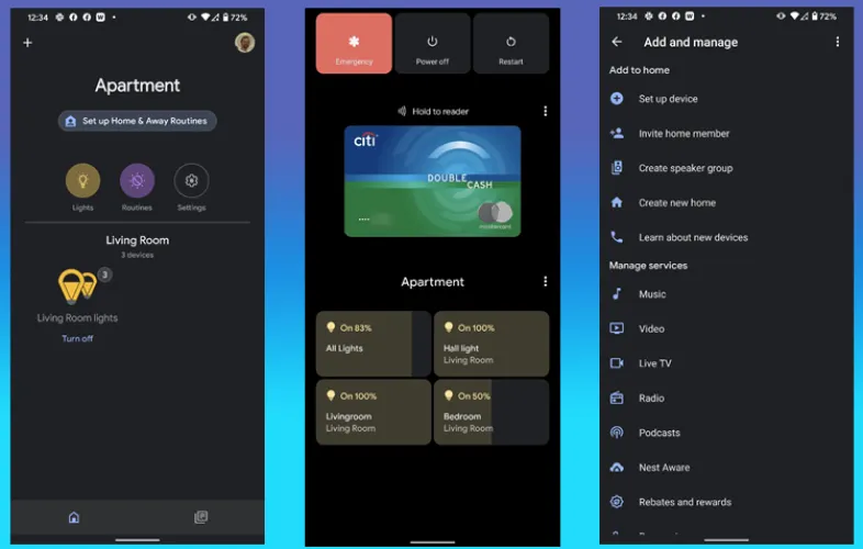 在安卓13版中,控制智能家居设备变得更容易。如果长按电源按钮,会出现一个屏幕,上面有用于控制灯泡和其他设备的大按钮。要做到这一点,你需要在谷歌主页应用程序中设置这些设备,并为这些设备创建一个房间。