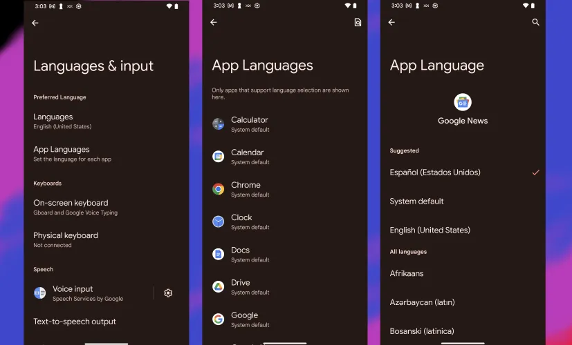 在安卓13中,多语种安卓用户可以在每个应用的基础上设置他们的首选语言。要选择您的首选语言,请进入设置>系统>语言和输入。选择应用程序语言,然后选择要修改的应用程序。你也可以在应用程序设置中找到这一功能(进入设置>应用程序)。选择要更改的应用程序,然后选择语言。请注意,此功能并不是通用的;开发人员必须选择使用它。