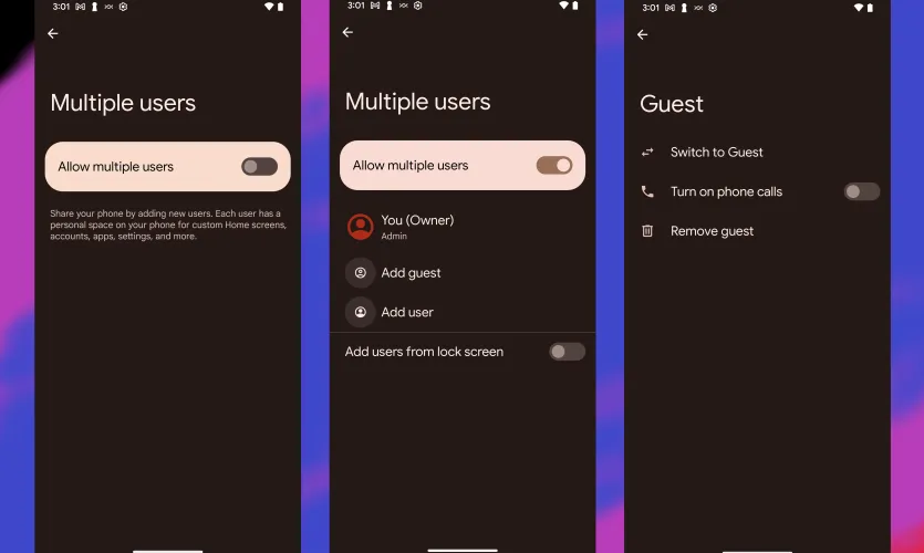 如果你想给其他人比屏幕锁定所允许的更多的访问权限,你可以。要让别人借用你的手机,但不能访问你的应用程序、数据或设置,也不能发送短信,请进入设置>系统>高级>多用户并启用它。您可以选择启用从锁屏添加用户的滑块。现在,你可以从手机顶部向下滑动两次,进入快速设置。点击右下角的用户图标,然后选择Add Guest。这款手机需要一段时间才能切换到该模式,该模式会删除所有个人账户(如电子邮件),但允许打电话、地图和浏览网页等功能。只有默认的Android应用程序才会出现,所以你不必担心你的客人为你的账户发送Facebook帖子或推文。