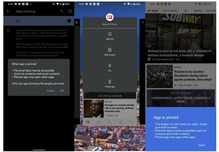 这是我们在ExtremeTech.com上的朋友们提供的一个很好的提示:如果你需要将手机交给其他人,而不想让他们在其他应用程序中窥探,只需固定屏幕即可。如果默认情况下未启用此功能,您可以在安全菜单中将其打开。在多任务界面中,点击任一应用上的应用图标,然后选择“Pin”,以防止他们切换应用。你可以通过要求手机PIN来保护切换应用程序。请注意,应用程序切换视图中的应用程序图标还可以让你拆分屏幕,暂停应用程序的通知,并查看其信息。