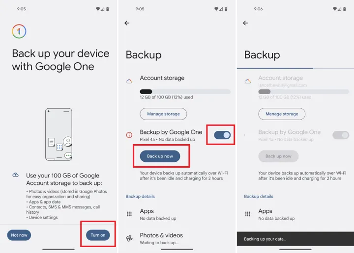 在Backup Options(备份选项)屏幕中,确保Backup by Google One(Google One备份)开关已打开。然后点击Back Up Now。备份运行,在此期间Back Up Now(立即备份)按钮灰显。