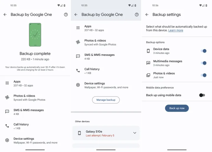 谷歌提供了一个内置的备份工具,通过该工具,你可以使用Google One服务通过你的账户备份内容。如果你有Galaxy设备,你可以通过你的三星账户备份数据。其他制造商可能会提供类似的功能。