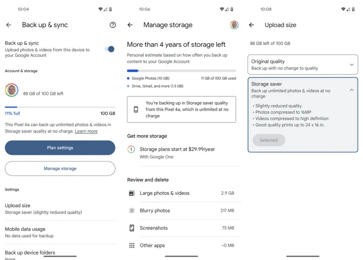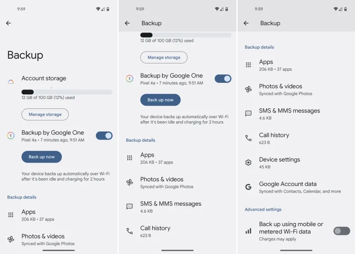 帐户存储部分显示您的帐户分配总量中有多少数据正在使用。向下滑动屏幕到备份详细信息部分,查看每个类别的备份数据量-应用程序、照片和视频、短信和彩信、通话记录、设备设置和谷歌帐户数据。