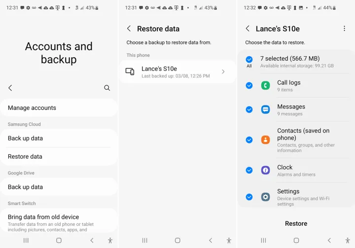 打开设置>帐户和备份,然后点击还原数据。确保列出了正确的设备,然后选择它。查看不同类型的内容以了解哪些内容将被恢复。