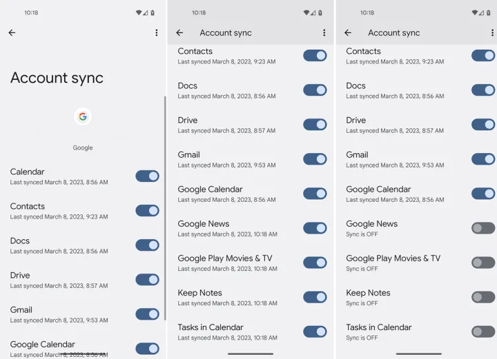 从Backup屏幕中,选择Google Account Data选项。然后,您可以关闭不想同步的任何数据的开关,包括日历、联系人、文档、Google Drive文件、Gmail、Google News、Google Play电影和电视节目、笔记和任务。
