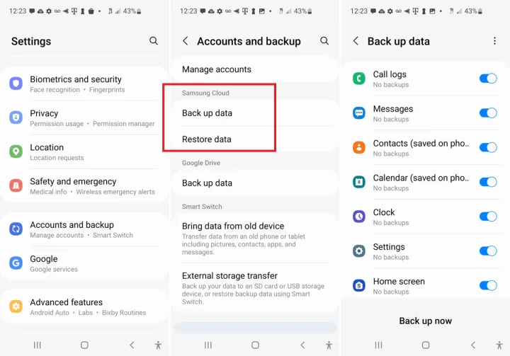 一些安卓设备制造商提供了自己的备份选项。对于三星,你需要一个三星账户。在您的Galaxy设备上,打开设置>帐户和备份。在三星账户或三星云部分,点击备份数据。默认情况下,选择要备份的所有数据类型。如果您不想保留任何内容,请关闭该开关。点击Back Up Now(立即备份)运行该过程。