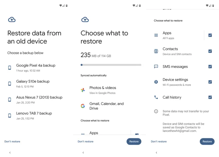登录到您的Google帐户并继续安装过程。您将进入一个屏幕,提示您从旧设备恢复数据。选择要还原的备份,然后输入旧设备和备份的密码以确认此操作。