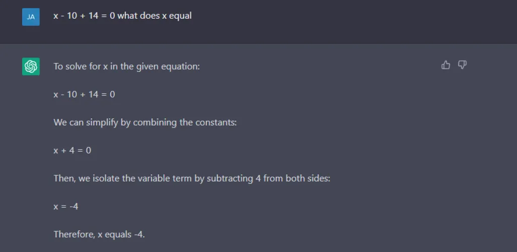 如果你像我一样在数学上苦苦挣扎,你可以同时使用ChatGPT作为计算器和家教。让它解一个复杂的数学方程式,聊天机器人会给你答案,同时还会展示它的工作。在本例中,我要求它在X-10+14=0时求解X。诚然,这不是最难解的公式,但要注意它是如何做到的。ChatGPT不只是吐出答案,它还打破了方程式,引导你完成寻找答案的过程。
