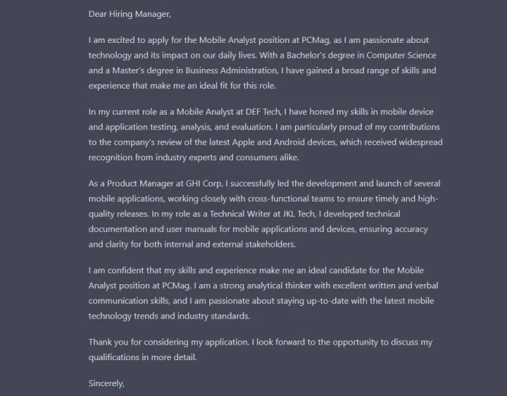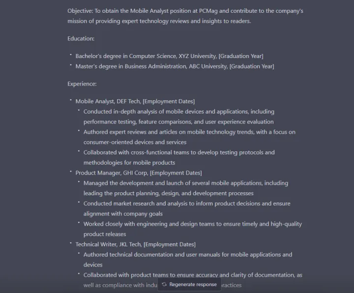 没时间吗?让ChatGPT为您做这件事。我要求聊天机器人为正在申请成为PCMag移动分析师的人制作一份简历,截至撰写本文时,该职位目前尚有空缺。它不仅为简历构建了一个可用的模板,还添加了应聘者可能在自己的简历上拥有的职业细节。