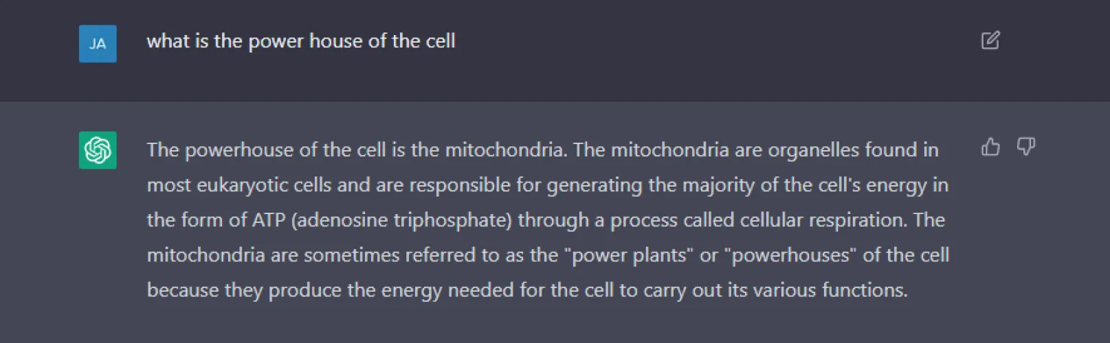 作为另一个例子,我问ChatGPT“细胞的能量屋是什么”,这个问题的答案可能会铭刻在任何上过中学科学课的人的记忆中。ChatGPT正确地回答了是线粒体,但也提供了关于ATP和细胞呼吸的额外信息。