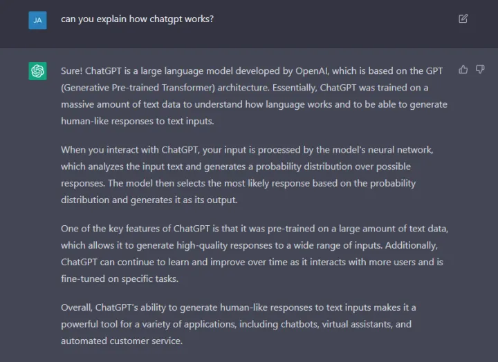 作为一个例子,我要求ChatGPT解释一下,好吧,ChatGPT。它给了我一个四段式的回复,讲述了OpenAI是如何通过向它提供大量文本数据来训练它的。然而,一旦它开始谈论神经网络,我就开始感到非常迷茫,我的眼睛呆滞了。