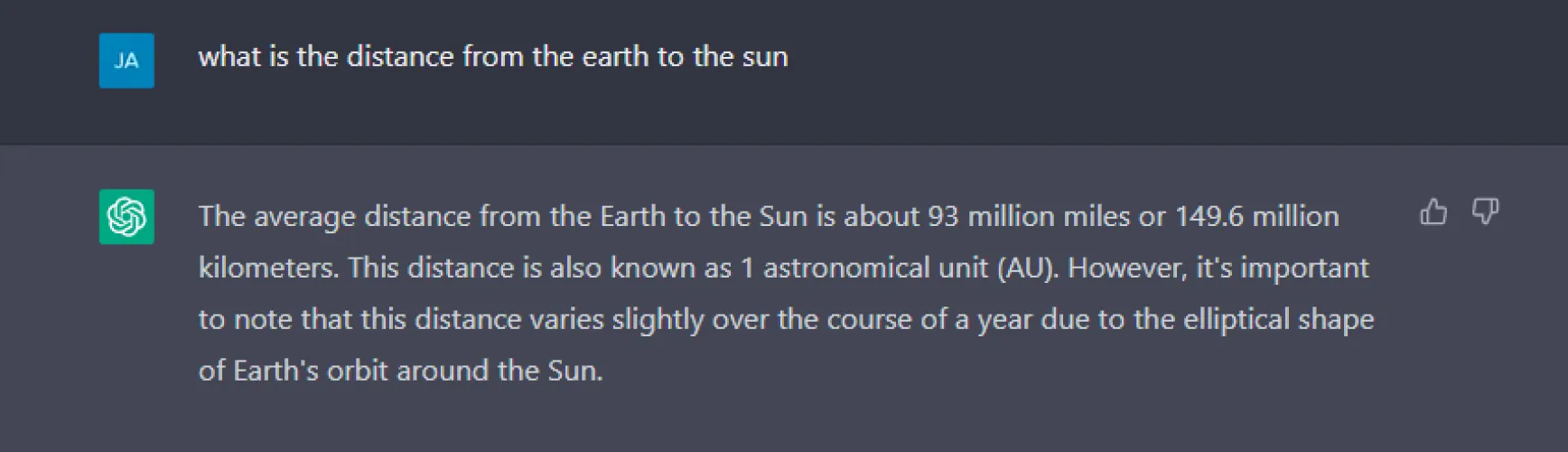 就像你使用谷歌来获取问题的答案一样,你也可以从ChatGPT请求同样的信息。只需提交一个查询,聊天机器人就会给出响应;不需要点击多个链接。例如,我问了ChatGPT“从地球到太阳的距离是多少”,我认为这个问题很容易回答和事实核查。人工智能表示,这一距离为9300万英里,这是由NASA支持的