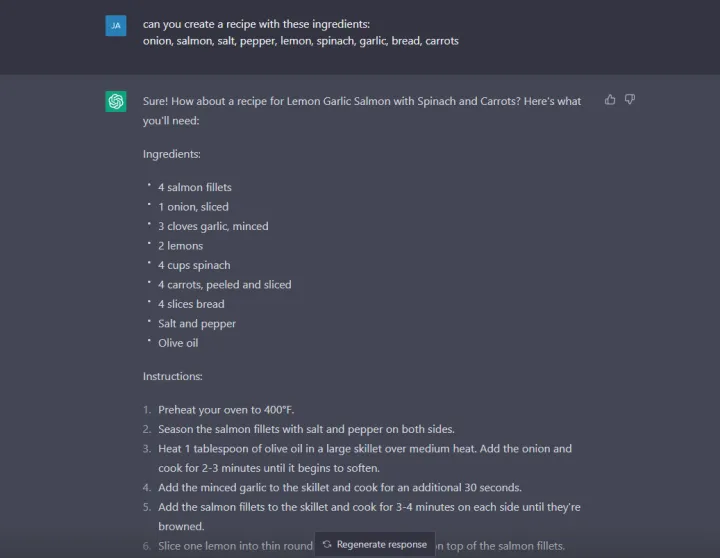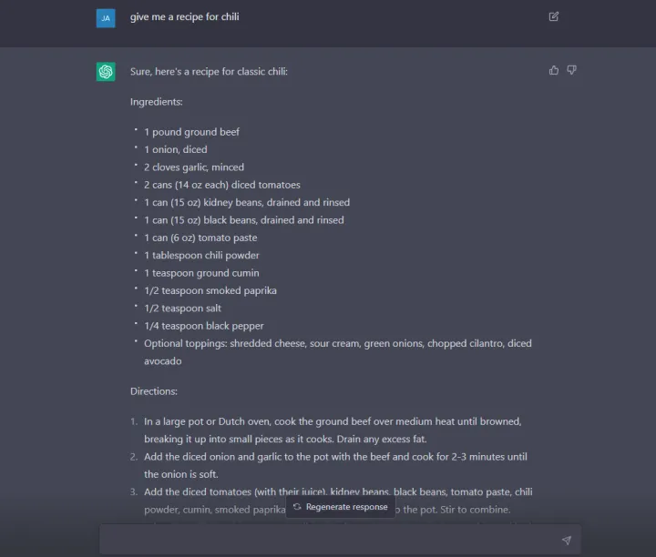 不知道今晚要做什么?ChatGPT可以生成简单易用的食谱。在上面的例子中,我向它索要了一份辣椒食谱,它给了我一个通用的指南,上面有一张配料清单和一步一步的指导,帮助我完成准备和烹饪阶段。如果你不想去商店,可以用手头上的任何东西向ChatGPT索要食谱。