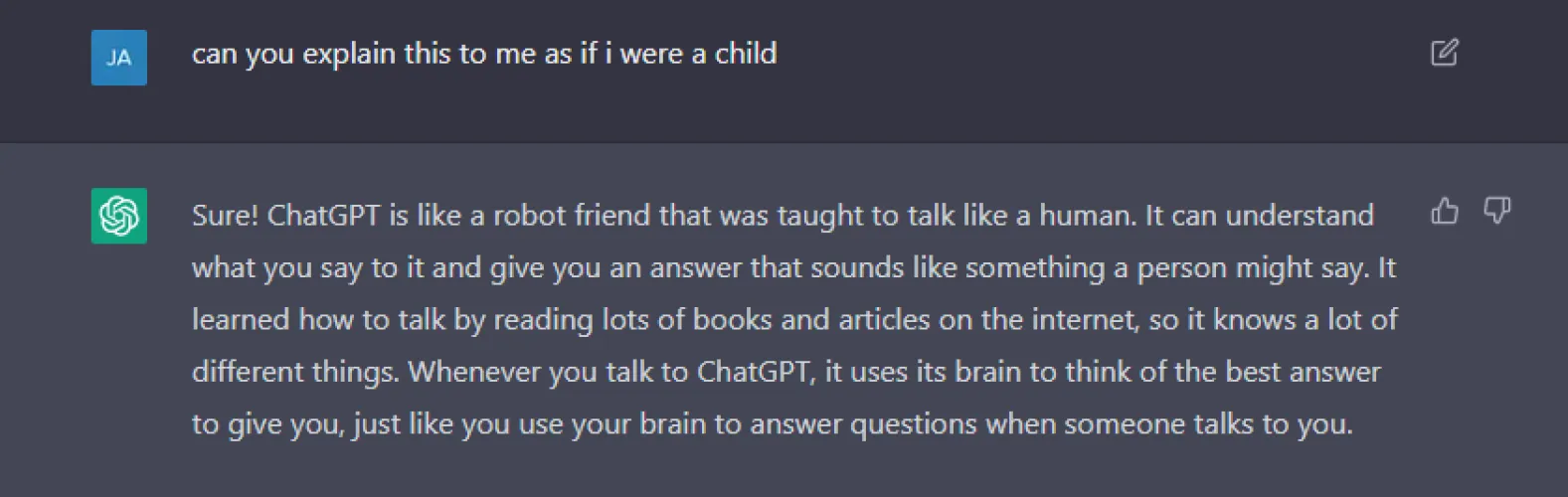 为了得到一个我可能更好理解的解释,我问道:“你能像我是个孩子一样给我解释这个吗?”然后,它迅速给出了一个我的大脑可以理解的简化答案。